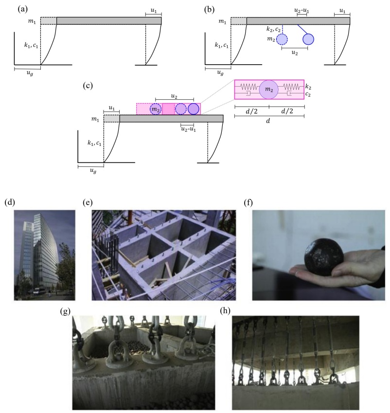 La respuesta de un sistema de 1GDL se estudia aquí para tres configuraciones: (1) un sistema de 1GDL sin amortiguadores; (2) un sistema de 1GDL con AMR; y (3) un sistema de 1GDL con AP (Fig. 1). Cabe hacer notar que en la Figura 1 también se muestran fotografías de un sistema de amortiguación de partículas instalado en un edificio en Santiago de Chile (Lu et al. 2012). El sistema funcionó muy bien durante el terremoto de 2010 en Maule, Chile y el edificio no sufrió ningún daño por encima del suelo o en cualquier piso subterráneo o paredes del sótano. En este estudio, un AMR es un dispositivo de control pasivo agregado a la parte superior del sistema, que consiste en una masa suspendida en una cuerda o barra pendular, sintonizada a cierta frecuencia natural del sistema. De esta manera, parte de la energía cinética de la estructura principal se transfiere a la masa suspendida (e.g., Den Hartog 1947, Fig. 1b). Por otro lado, un AP es un contenedor dentro del cual hay una o más partículas de acero, que, a través de las colisiones entre partículas, colisiones entre partículas y la pared del contenedor, suprimen vibraciones del sistema principal (e.g., Masri y Ibrahim 1973, Fig. 1c). Los movimientos sísmicos del suelo se ingresan como aceleraciones horizontales en la base. Las ecuaciones gobernantes de movimiento para cada configuración se presentan aquí.