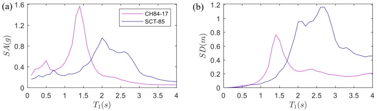 La respuesta inducida por sismos de las estructuras de 1GDL con AMR y AP durante los movimientos sísmicos de suelos de banda estrecha es muy sensible a la aceleración espectral, la duración y el contenido de frecuencia, así como a otras medidas de intensidad. La influencia del contenido de frecuencias del movimiento del suelo en la respuesta de la estructura de 1GDL se explica en este estudio mediante el uso de dos registros sísmicos de banda estrecha, representativos de movimientos de alta intensidad obtenidos en las estaciones acelerométricas CH84 y SCT, que se instalan sobre sitios de suelos blandos. Ambas estaciones están ubicadas sobre suelos arcillosos en lo que se conoce como la zona lacustre en la Ciudad de México. Estos sitios son de particular importancia ya que han registrado los movimientos sísmicos más intensos y destructivos desde que se instalaron los acelerómetros en la Ciudad de México. El primero a estudiar corresponde a un evento sísmico de Mw=7.1, ocurrido el 19 de septiembre de 2017 (CH84-17). El segundo a estudiar ocurrió el 19 de septiembre de 1985 (SCT-85), con magnitud Mw=8,1. La Figura 4 muestra los espectros de respuesta de aceleración SA (izquierda) y desplazamiento SD (derecha) del registro utilizado en este estudio. Estas representaciones muestran que el período dominante del suelo, T s , es alrededor de 1.4 y 2 s para los sitios CH84 y SCT, respectivamente. Esto significa que las relaciones de frecuencia entre la frecuencia predominante de la excitación del movimiento del suelo ω s y la frecuencia predominante de cada edificio ω 1 en estudio es cercana a la unidad i.e, r ω = ω 1 / ω s ~ 1 .