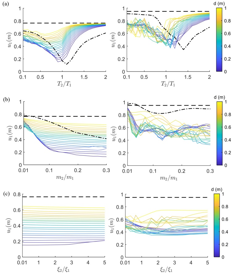 En el Apéndice A se presentan figuras adicionales donde se muestran los desplazamientos máximos de la partícula u 2 versus los tres parámetros (i.e., T 2 / T 1 , m 2 / m 1 , ξ 2 / ξ 1 ) de control de vibración de los AP. Se aprecian tendencias de desplazamiento comparables a las que se muestran en la Fig. 5.