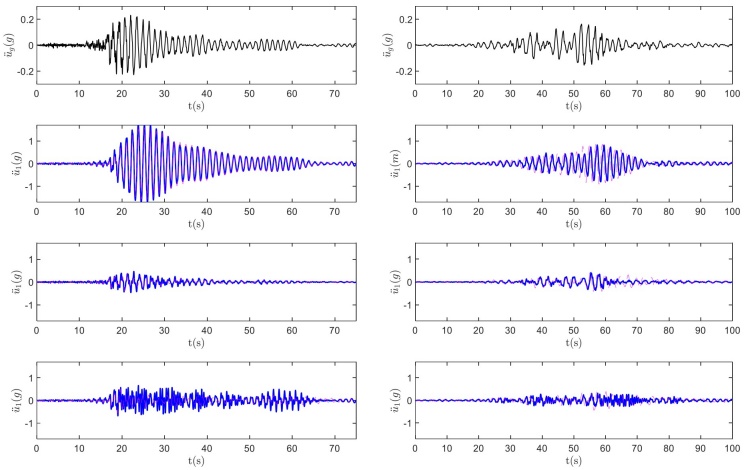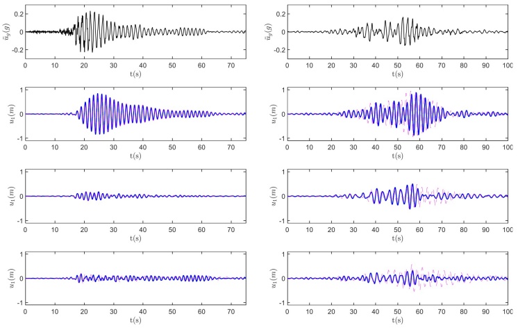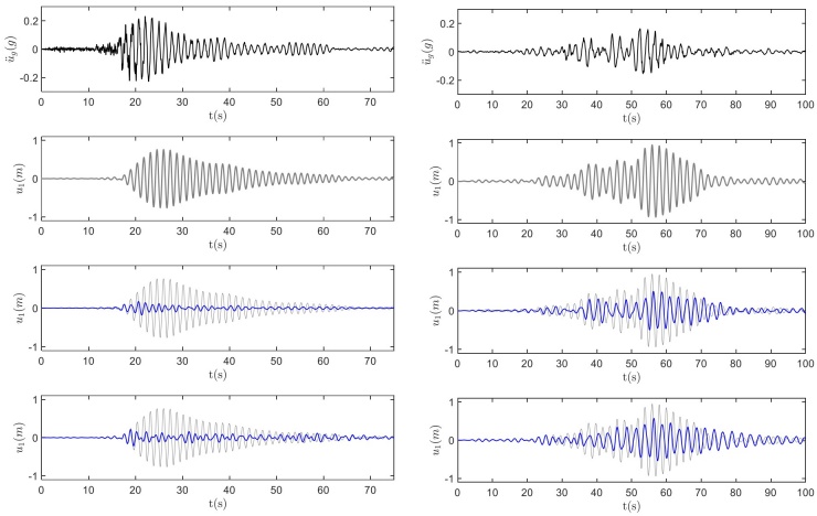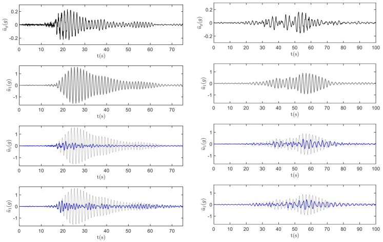 Además, la Figura 6 muestra una comparación directa de la respuesta de 1GDL con AMR y AP con la respuesta del sistema de 1GDL simple (líneas grises). Los resultados ilustran que el desplazamiento del sistema de 1GDL disminuye significativamente si se le instala un AMR (tercera fila desde arriba) o un AP (cuarta fila desde arriba).