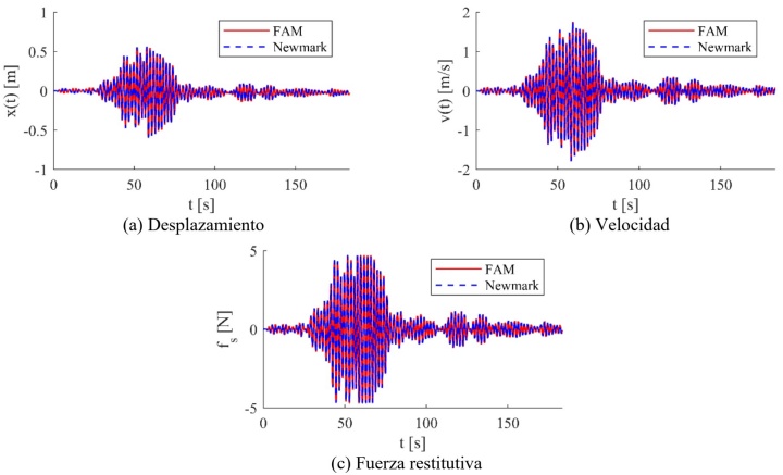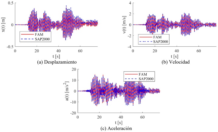 La validación de la metodología se realizó mediante dos estudios de caso. El primero se enfocó en un sistema de un grado de libertad, mostrando que el FAM proporciona resultados comparables con los obtenidos a través del método de Newmark para sistemas no lineales, con diferencias menores al 1% en desplazamientos, velocidades y aceleraciones máximas. El segundo estudio abarcó una estructura de múltiples grados de libertad, donde los resultados obtenidos con el FAM se compararon con los de SAP2000 para excitaciones sísmicas y eólicas. La mayor diferencia observada fue en la distorsión de entrepiso, aunque la tendencia general de la distorsión fue consistente con la obtenida mediante SAP2000. En el análisis eólico el FAM completó el análisis en 27.36 segundos, mientras que SAP2000 presentó dificultades de convergencia, deteniéndose después de tres horas de cálculo y solo 11 segundos de integración.