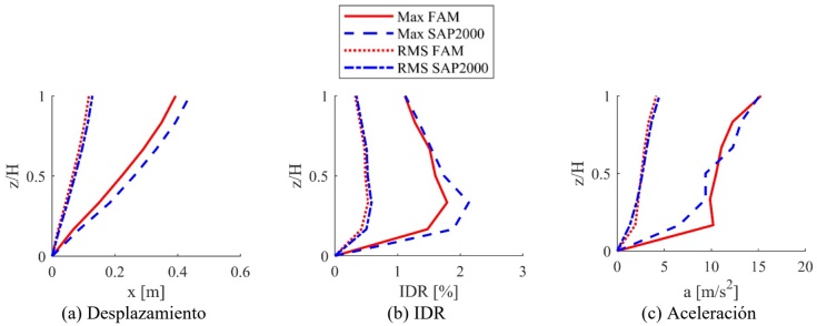 Los resultados presentados en la Figura 11 indican que ambos modelos exhiben tendencias similares. En cuanto a los valores máximos, el modelo del SAP2000 muestra amplitudes más elevadas en comparación con el FAM para los desplazamientos y distorsiones. El desplazamiento máximo se observó en la azotea, la distorsión máxima en el segundo entrepiso y la aceleración máxima también en la azotea. La respuesta máxima de desplazamientos aumenta con la altura, y la respuesta RMS es aproximadamente la cuarta parte de la respuesta máxima. La distorsión máxima alcanzada con el FAM es mayor que 1.75%, lo que excede el límite admisible para estructuras con ductilidad baja y se encuentra cercana al límite de estructuras con ductilidad media, según las NTC-DS-17 (2017). En cuanto a las aceleraciones, se observa que el perfil RMS aumenta de amplitud con la altura y el perfil máximo tiene aproximadamente la misma tendencia; además, las aceleraciones máximas ocurren en la parte superior del edificio, con un valor mayor que 1.5g, lo que representa una importante magnitud en la respuesta de la estructura. Asimismo, se aprecia que las amplitudes de los valores RMS de la respuesta de ambos modelos presentan una mayor similitud en contraste con los valores máximos. Estas diferencias pueden atribuirse principalmente a variaciones en el método de integración numérica, los algoritmos de solución de los sistemas de ecuaciones y las tolerancias internas del programa de análisis.