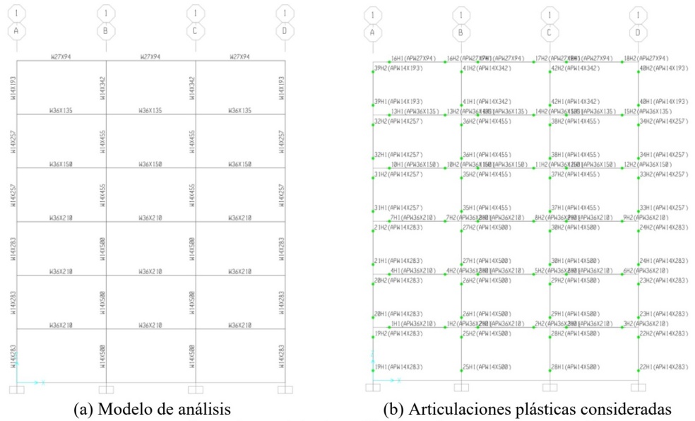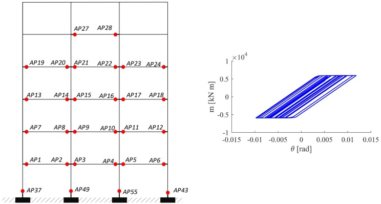 En total se formaron 30 articulaciones plásticas en ambos modelos, la posición de las articulaciones plásticas se muestra en la Figura 12. Las articulaciones con mayor rotación alcanzada fueron la AP49 y la AP55, ubicadas en las columnas de la planta baja, para ambas articulaciones los lazos de histéresis obtenidos son semejantes, debido a la simetría de la estructura.