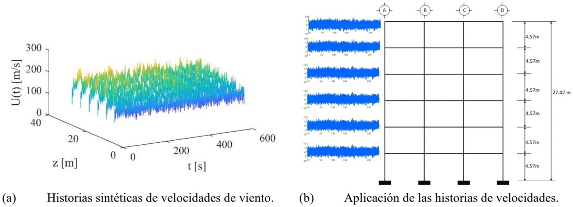 Se realizaron simulaciones de historias de viento con una duración de 600s, correspondientes a cada 4.57m, que es la altura entre niveles de entrepiso (Figura 15a), que se aplicaron en cada entrepiso (Figura 15b). Para la aplicación de fuerzas se consideró un coeficiente CD= 0.80.