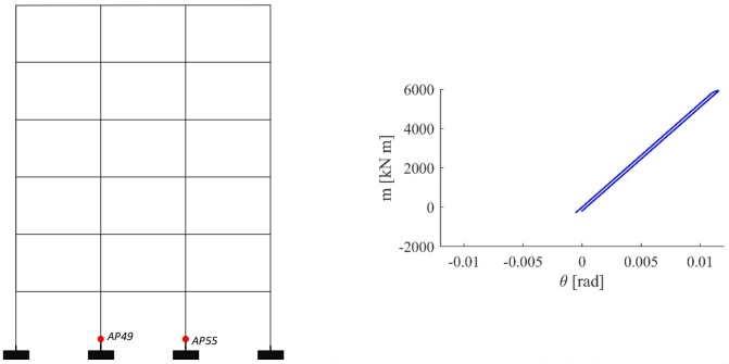 Para el caso de las distorsiones de entrepiso, se observa que la mayor amplitud de la RMS como el valor máximo, se presentan para z/H=0.30, con un valor máximo de 1.2%, que de acuerdo con las NTC-DS-17 (2017), se tiene que este marco se encuentra cerca del límite admisible para estructuras con ductilidad baja. El RMS de las aceleraciones y su valor máximo aumentan con la altura, presentándose una aceleración máxima de 0.5g, el cual se considera fuera de los límites de servicio por confort de los ocupantes. Se calcularon los elementos mecánicos en la base, el cortante basal fue de V b =6,773 , y el momento de M b =112,985 . Se formaron 2 articulaciones en el primer nivel de la estructura, la AP49 y la AP55, debido a la regularidad de la estructura, los lazos de histéresis obtenidos en ambas articulaciones son iguales (Figura 18).