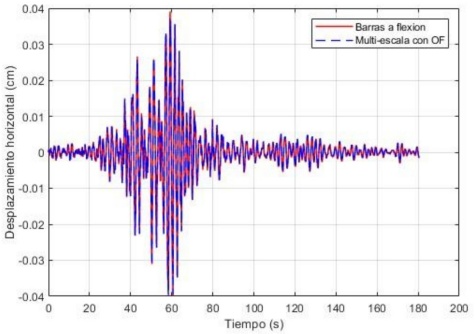El análisis ante carga sísmica tiene una configuración de forma análoga a las pruebas pseudo-dinámicas, donde el esclavo realiza una serie de análisis estáticos, mientras que el maestro realiza un análisis dinámico en el tiempo, en este ejemplo con el algoritmo de solución de Newmark (β=1/4) y amortiguamiento del 5%. Los resultados del análisis, mostrados en la Figura 10, permiten concluir que la introducción de esta zona de detalle no induce importantes cambios en la respuesta; la máxima diferencia se presenta en el tiempo 60.77 s y representa el 4.91% de la amplitud. Por otra parte, los modos de vibrar, mostrados en la Figura 11, resultan similares en forma y en periodo, comparados en la tabla 4.