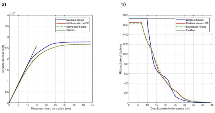 Como indicador global del proceso de daño, en la Figura 15, se muestran los resultados de la prueba de empuje lateral con control de fuerzas, motivo por el cual se monitorea hasta la aparición de rigidez cero. En el modelo de elementos marco se tiene una curva con una rama lineal (sin daño) de mayor longitud hasta u Barras =9.70 cm en azotea y que tiene cambios abruptos en la rigidez cuando inicia la formación de lo que sería cada una de las articulaciones plásticas; mientras que los modelos de elemento finito y multi-escala tienen una degradación más suave de la rigidez en u EF =6.80 cm y u ME =6.70 cm, ya que el daño se manifiesta separadamente en cada uno de los elementos finitos de las zonas de mayor demanda. En la tabla 6 se presentan las cantidades más generales para comparar la respuesta de los modelos, mostrando la tendencia de los análisis multi-escala hacia un modelo refinado, con un tiempo de análisis significativamente menor.