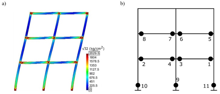 Como indicador de los procesos de daño a nivel local, se presenta en la Figura 16.a el estado de esfuerzos de von Mises obtenido del análisis de elemento finito para el paso de carga última, el valor que alcanza un punto cuando se presenta su fluencia es 2029.5 kg/cm2. En la Figura 16.b, se describe el orden de ocurrencia de las articulaciones plásticas: las primeras cuatro articulaciones ocurren en las vigas del primer nivel; posteriormente, ocurren otras cuatro articulaciones en las vigas del segundo nivel; finalmente, ocurren articulaciones en las columnas central, izquierda y derecha, respectivamente. Cuando se articulan todas las columnas en la parte inferior, el sistema de ecuaciones deja de ser estable, por lo que no se continua con el análisis.