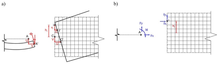 Incluso cuando los grados de libertad no coinciden en ambos sistemas, el acoplamiento debe satisfacer tres condiciones: equilibrio de fuerzas, congruencia en la cinemática y continuidad en los campos de estudio. El equilibrio de fuerzas en la interfaz de acoplamiento entre las dos sub-escalas se establece por medio de las ecuaciones 2 a 4, donde f x i y f y i son las fuerzas en dirección de los ejes locales en el nodo i, h i es el brazo de palanca de f x i , medido del centroide de la sección al nodo i, F x la fuerza axial en el extremo del elemento marco, F y la fuerza cortante y M el momento flexionante.