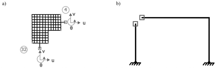 Sub-estructuración del marco de un nivel para el análisis en dos escalas. a) Modelo esclavo en escala local y b) Modelo maestro en escala global.