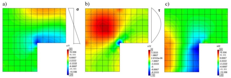 Resultados del análisis estático en el marco de un nivel. Estados de esfuerzo en kg/cm2 en la zona de detalle. a) Esfuerzo normal en la viga, σxx. b) Esfuerzo cortante en la viga, σxz. c) Esfuerzo perpendicular a las fibras de la viga, σzz.