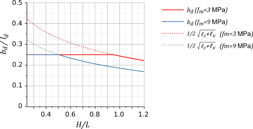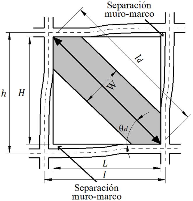 donde E f y E m son el módulo de elasticidad del material del marco y de la mampostería, respectivamente; I c y I v son el momento de inercia de la sección transversal bruta de las columnas y la viga; t, H y L son el espesor, la altura libre y la longitud del muro, respectivamente; y θ d es el ángulo que forma la diagonal del muro con la horizontal.
