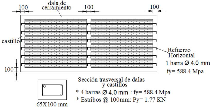 Las dimensiones globales del muro correspondientes al edificio prototipo de tres niveles fueron 1375 mm de altura y 3325 mm de longitud, teniendo una relación de aspecto igual a 0.414. Las dimensiones globales del muro correspondientes al edificio prototipo de seis niveles fueron 1350 mm de altura y 3250 mm de longitud, teniendo una relación de aspecto H/L igual a 0.415. Las dimensiones nominales de las piezas, de tabiques rojo recocido, fueron 25x65x125 mm y las juntas de mortero tuvieron un espesor igual a 7 mm. Los detalles del refuerzo y dimensiones en los muros se muestran en la Figura 10.