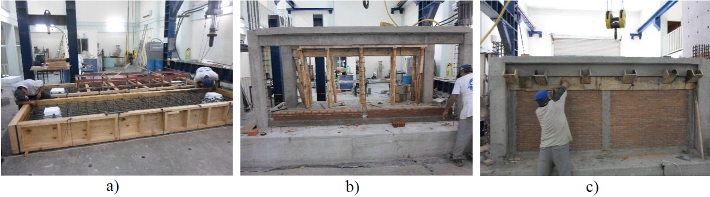 En todos los casos, el marco se construyó primero, y después de siete días, el marco se rellenó con un muro de mampostería. Monolíticamente con la viga del marco, se construyó una losa de 100 mm de espesor para conectar al espécimen con la viga de acero utilizada en el sistema para aplicar la carga lateral. Para los muros con elementos de confinamiento, se construyó una dala de desplante sobre la cimentación, en la cual se anclaron los castillos del muro (Figura 11b). Los castillos se colaron después de que la mampostería se construyó. Para garantizar que el marco estuviera en contacto con el muro, se construyó una dala de cerramiento con el sistema de colado que se muestra en la Figura 11c. Se vertió concreto con un revenimiento mayor a 180 mm a través de ventanas en la cimbra, mismas que se observan en la Figura 11c. El concreto acumulado en dichas ventanas proporcionó la presión hidrostática suficiente para rellenar completamente la dala de cerramiento. Una vez que el concreto fraguó, el exceso se removió mediante un dispositivo mecánico de corte. En la parte superior de cada columna, se ancló una placa de 19.1 mm de espesor para conectar el sistema usado para aplicar la carga vertical. En los especímenes sin elementos de confinamiento, el muro se construyó directamente sobre la cimentación y la mampostería se puso en contacto con el marco con el mismo mortero que se utilizó en las juntas.