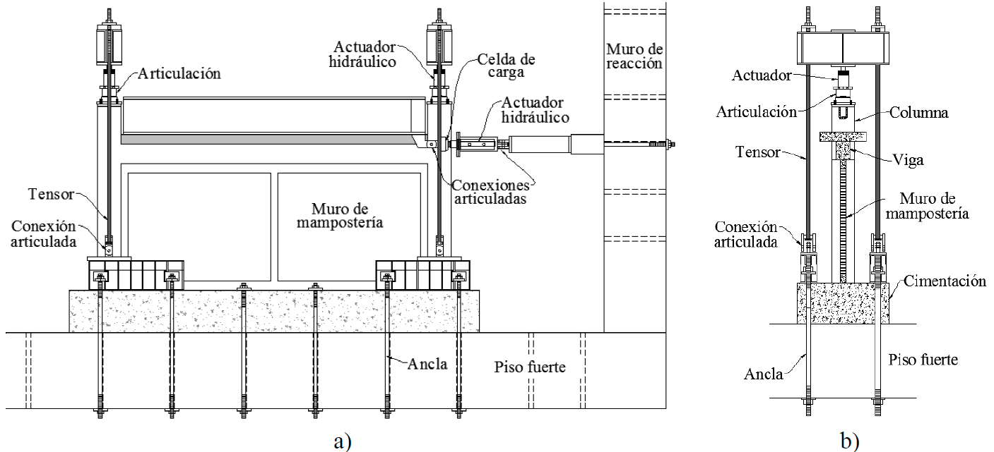 El marco de carga que se utilizó durante los ensayes se muestra en la Figura 12. La carga vertical se aplicó directamente sobre las columnas con actuadores hidráulicos, los cuales reaccionaron contra una viga de acero anclada a la cimentación mediante tensores a cada lado del muro (Figura 12b). La magnitud de las acciones fue la correspondiente a las cargas gravitacionales de los pisos superiores y la carga muerta del piso inferior. El peso de la viga de acero colocada sobre la viga del marco, usada para transferir la carga lateral al espécimen, correspondió a la carga viva del piso inferior. Para simular la transmisión de la carga sísmica por medio del sistema de piso, en forma distribuida, la carga lateral se aplicó a una viga de acero, la cual fue atornillada a la viga del marco (Figura 12a).