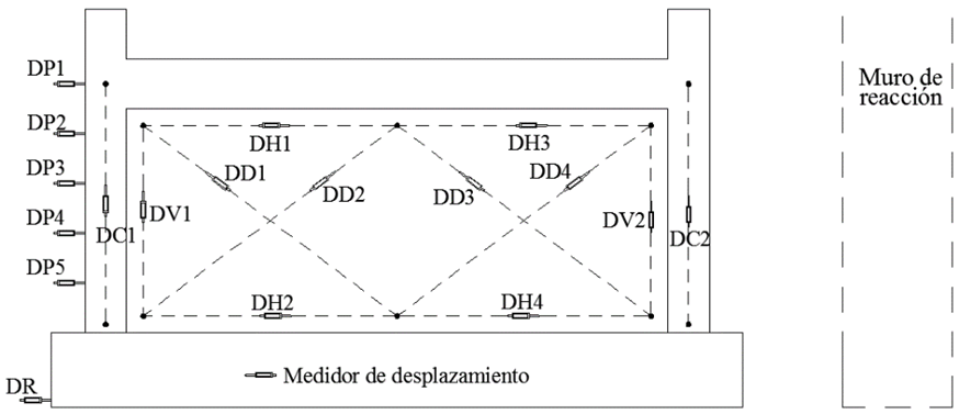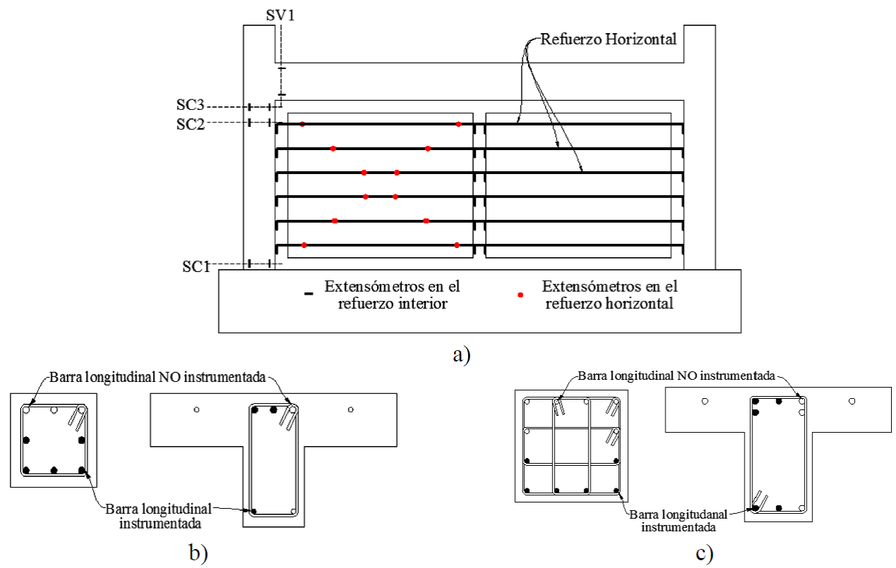 Los especímenes se instrumentaron debidamente para poder registrar las cargas aplicadas, los desplazamientos laterales y las deformaciones en el acero de refuerzo horizontal en los especímenes que lo incluían. Además, se midieron las deformaciones en el refuerzo longitudinal en tres secciones transversales de las columnas y una sección de la viga. En la Figura 14 y la Figura 15 se presentan la instrumentación interna y externa, respectivamente, para medir los parámetros de interés.
