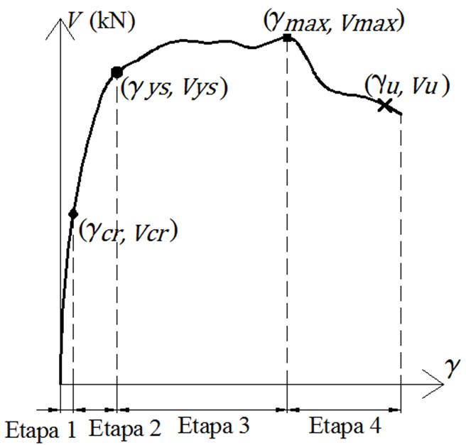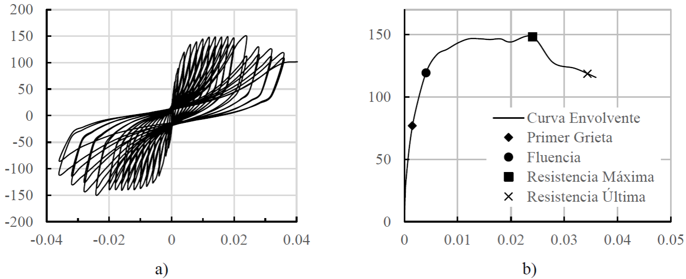 En la Figura 16b se presenta la curva envolvente correspondiente, incluyendo sus puntos críticos: primer agrietamiento ( γ c r , V c r ) , fluencia ( γ y s , V y s ) , resistencia máxim ( γ m a x , V m a x ) , y falla o resistencia última ( γ U , V U ) . En la Tabla 4 se resume los valores de la distorsión y la carga lateral correspondientes a los puntos críticos.