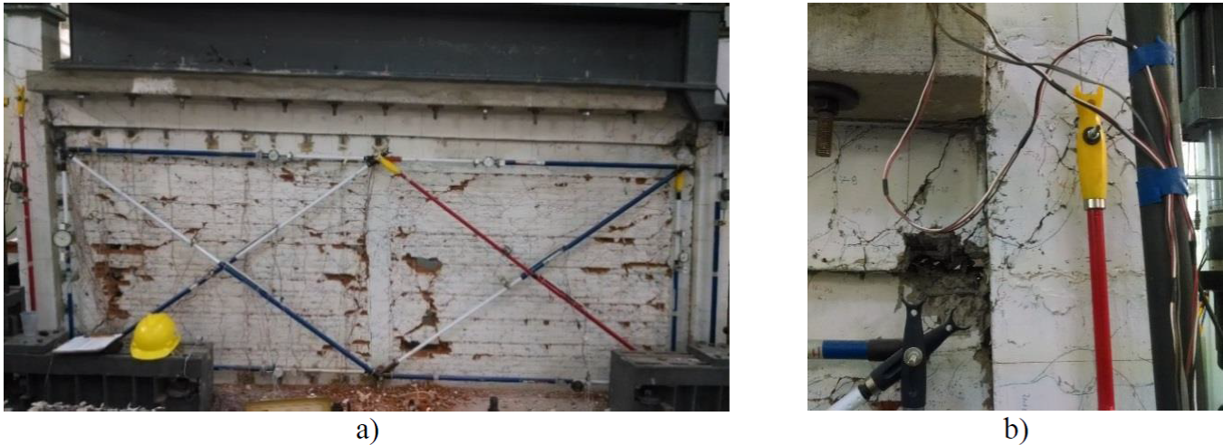 En todos los especímenes, el modo dominante de falla del sistema fue una combinación de deslizamiento y tensión diagonal en el muro, y falla en la conexión viga-columna del marco. El patrón final de agrietamiento del espécimen MD3NRH se muestra en la Figura 18. Se incluye un detalle de la falla en la conexión viga-columna.