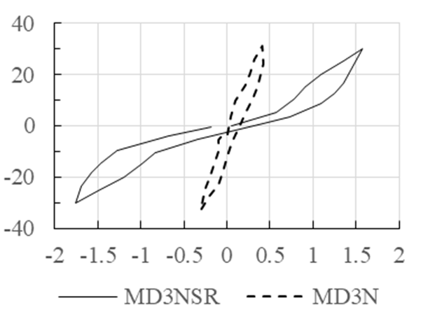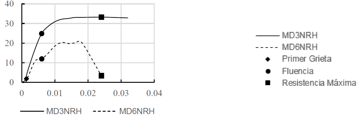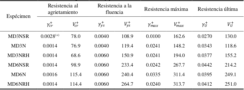 Las NTCM (2017) predicen apropiadamente la resistencia lateral de los especímenes en la mayoría de los casos. Para los especímenes MD3NSR, MD3N, MD6N y MD6NRH el porcentaje de error fue menor a 10%. Sin embargo, el caso del espécimen MD3NRH la predicción fue 25.8% menor.