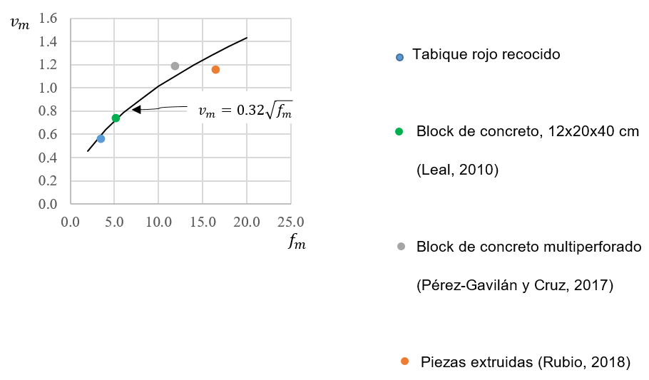 Para lograr expresar las Ecuaciones 15 y 16 en términos de f m ' es necesario relacionar dicho valor con la resistencia a compresión diagonal de diseño de la mampostería ( v m ' ). En la Figura 4 se presentan los valores medios de la resistencia a compresión ( f m ) y la resistencia a compresión diagonal ( v m ) para distintos tipos de mampostería, obtenidos en algunas investigaciones experimentales desarrolladas en México. Con base en estos resultados se encontró la Ecuación 22 (ver Figura 4).