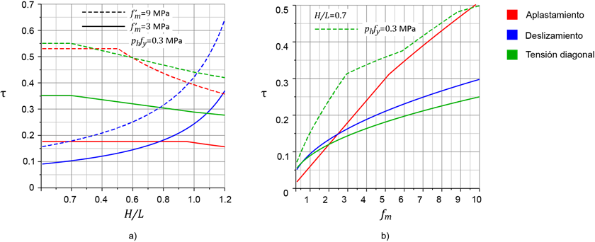 En la Figura 6b se presenta la variación del esfuerzo cortante resistente, τ, para los distintos modos de falla, en función de la resistencia a compresión de diseño de la mampostería, para un valor fijo igual a 0.7 de la relación de aspecto. Las curvas con líneas continuas corresponden a un muro sin refuerzo horizontal. La resistencia a corte por tensión diagonal resulta menor a la resistencia por deslizamiento. El resultado depende del valor supuesto de v m ' . La curva con línea discontinua corresponde a un muro con refuerzo horizontal. En ese caso, la resistencia tensión diagonal aumenta significativamente por lo que ya no domina la falla. Para muros con mampostería de baja resistencia a compresión, f m ' < 2 MPa, el aplastamiento domina la falla.