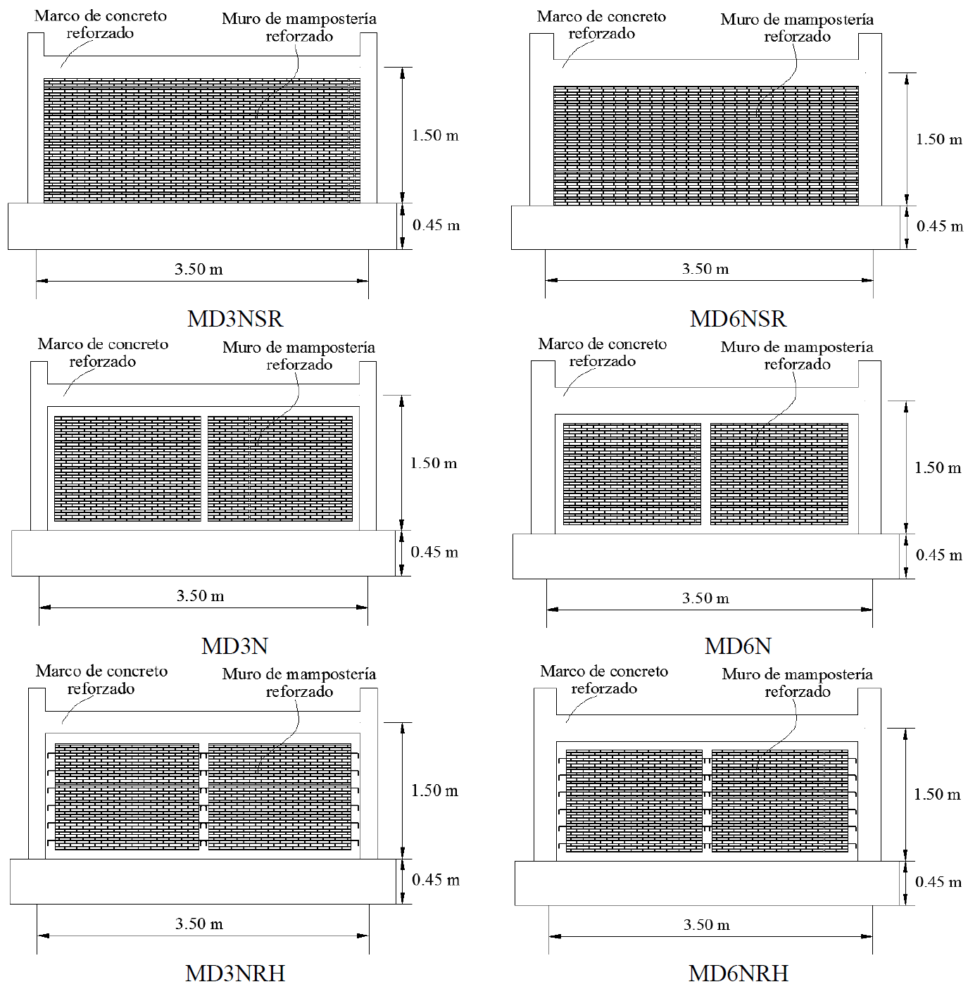 En el primer par de especímenes no se incluyeron elementos de confinamiento ni refuerzo horizontal (especímenes MD3NSR y MD6NSR). En el segundo par, se agregaron dalas y castillos al muro diafragma (especímenes MD3N, y MD6N). Debido a la relación de aspecto del muro, se incluyó un castillo central. Finalmente, en el tercer par, se agregó refuerzo horizontal en las juntas de mortero y se ancló a los castillos (especímenes MD3NRH y MD6NRH).
