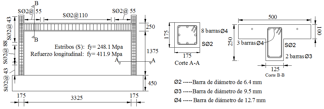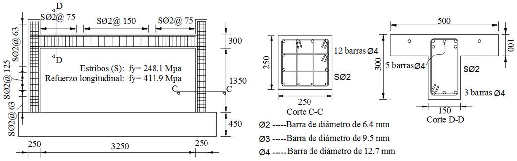 En la Figura 8 y la Figura 9 se presentan detalles del refuerzo y dimensiones de los marcos de los especímenes correspondientes a los edificios prototipo de tres y seis niveles, respectivamente. El refuerzo longitudinal en columnas y vigas consistió en barras de acero Grado 42 de 12.7 mm (No. 4) y 9.5 mm (No. 3) de diámetro con estribos de alambrón de 6.4 mm (No. 2) de diámetro. En las columnas, la cuantía de refuerzo fue 3.3% en especímenes de columnas de tamaño menor mientras que en especímenes de columnas de tamaño mayor fue 2.4%. El espaciamiento de los estribos fue reducido en los extremos de los elementos ya que se podrían desarrollar articulaciones plásticas en esas zonas. El refuerzo horizontal en el muro consistió en una barra de acero Grado 60 de 4.0 mm de diámetro colocada a cada seis hiladas (Figura 10).