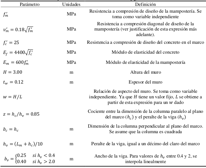 Se presenta a continuación un ejemplo del funcionamiento de las expresiones de resistencia a corte para distintos valores de relación de aspecto y distintos valores de resistencia a compresión de la mampostería. Los valores supuestos de las propiedades de los materiales y algunos parámetros geométricos del marco se presentan en la Tabla 1.