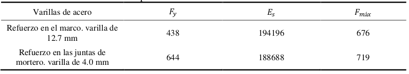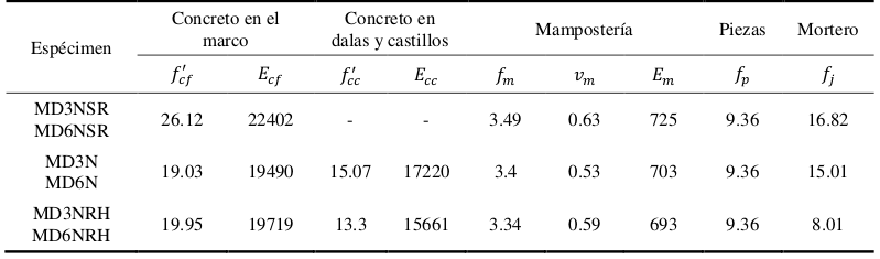 Cada una de las propiedades mecánicas de los materiales se obtuvo a partir de la norma del Organismo Nacional de Normalización y Certificación de la Construcción y Edificación (ONNCCE) correspondiente. Los resultados obtenidos en general tuvieron una baja dispersión. Debido a que los especímenes se construyeron en pares, las propiedades de los materiales corresponden a ambos especímenes en el par. En la Tabla 2 se presenta un resumen de los valores promedio de las propiedades de los materiales correspondientes a cada par de especímenes. En la Tabla 3 se presentan las propiedades mecánicas del acero, el cual se obtuvo de un mismo lote para la construcción de todos los especímenes.