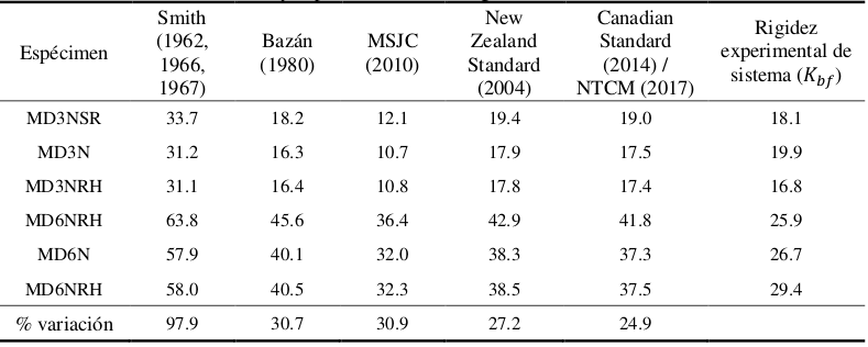 Los resultados analíticos se compararon con la rigidez experimental del modelo ( K b f ) , la cual se calculó como la pendiente de la línea que conecta el origen con el punto de fluencia de la curva envolvente del espécimen correspondiente. Los resultados se presentan en la Tabla 5, incluyendo la variación global promedio con respecto a los resultados experimentales para cada modelo de análisis. Se observa que, en general, con el modelo establecido en el código canadiense y las normas mexicanas se obtuvo la mejor aproximación a los resultados experimentales de los especímenes, a juzgar que en promedio se obtuvo la menor variación (24.9 %).