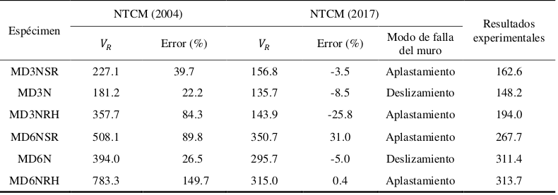 Se observa que las NTCM (2004) no predicen apropiadamente la resistencia lateral del sistema, en ninguno de los casos. La edición 2004 de las normas mexicanas sobreestiman la resistencia. La variación es significativamente mayor para los especímenes con refuerzo horizontal. Las normas sobreestiman un 22.2% y 26.5% la resistencia de los especímenes MD3N y MD6N, respectivamente; mientras que, para el caso de los especímenes con refuerzo, MD3NRH y MD6NRH, la resistencia se sobreestima un 84.3% y 149.7%, respectivamente. Este hecho se explica debido a que, de acuerdo a las NTCM (2004) la contribución del refuerzo se debe incluir, independientemente del modo de falla en el muro. Esto hace que la resistencia del muro con refuerzo sea elevada, y en consecuencia también la del sistema.